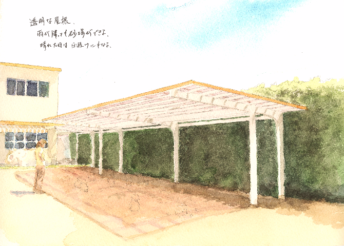 晴天の日も、雨の日も、いつでも砂場で遊ぶことができます。半透明な砂場用の屋根は、晴れている日は日よけになります。